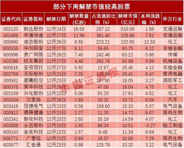 【申通快遞(002468)、股吧】解禁市值居次,達226.86億元,其下周五共有11.99億限售股即將解禁;誠志股份下周待解禁股份8.65億股,解禁市值達132.65億元。上述3只股票解禁股份類型均為定向增發(fā),目前均處于浮盈狀態(tài),其中韻達股份、申通快遞、誠志股份待解禁定增股浮盈分別為223.16%、19.02%、11.18%。