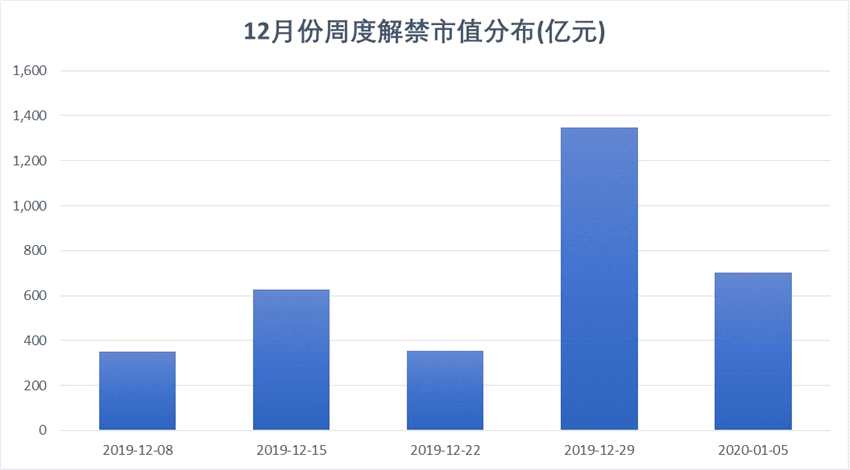 12月前三周大盤持續(xù)反彈,同時市場解禁壓力相對較小,周均解禁市值約433.89億元,較年內(nèi)周均644.35億元低約50%。然而,下周市場解禁壓力將陡增,迎來年內(nèi)最后一個超千億市值的解禁潮。