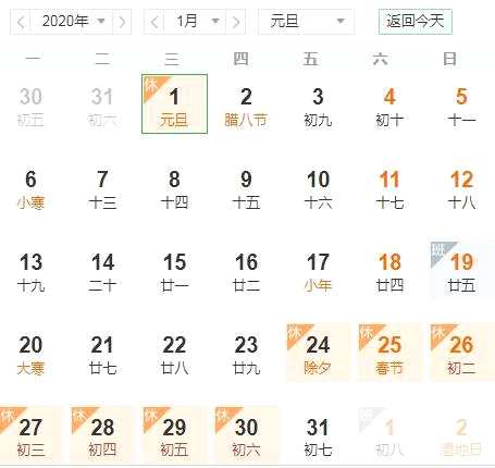 2020年1月1日元旦放假共1天,這一天股市也會(huì)休市;1月24日至30日春節(jié)放假調(diào)休,共7天。