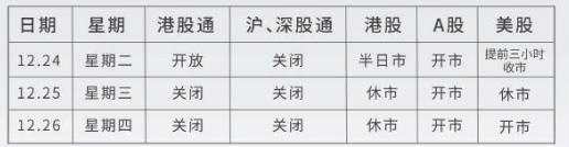滬、深股通方面,12月24日至12月26日均關(guān)閉服務(wù)。