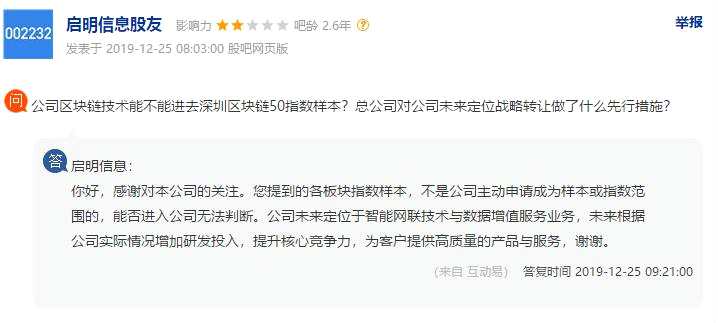該指數(shù)的發(fā)布也引起投資者的好奇,并在互動(dòng)平臺(tái)上提問:“公司區(qū)塊鏈技術(shù)能不能進(jìn)去深圳區(qū)塊鏈50指數(shù)樣本?”