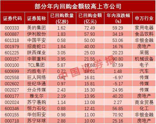 具體到單家公司,今年以來回購金額最多的是美的集團(000333),金額高達72.49億元;伊利股份(600887)以57.93億元的回購規(guī)模排名居次;中國平安(601318)、招商蛇口(001979)年內(nèi)回購了50億元、40億元,【陜西煤業(yè)(601225)、股吧】(601225)、中聯(lián)重科(000157)年內(nèi)回購金額也均超過了20億元。