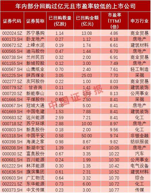 回購金額不低于10億元的公司還包括,TCL集團(000100)、均勝電子(600699)、巨人網(wǎng)絡(luò)(002558)、世紀華通(002602)、分眾傳媒(002027)、雅戈爾(600177)、【蘇寧易購(002024)、股吧】(002024)、恒力石化(600346)、華創(chuàng)陽安(600155)、蘇寧環(huán)球(000718)。