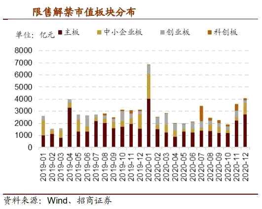 招商證券研報指出,主板、中小板、創(chuàng)業(yè)板、科創(chuàng)板對應(yīng)解禁市值分別為4033 億元、2061億元、733億元、32億元。解禁類型上,首發(fā)解禁、定增解禁、其他分別為3270億元、3555億元、34億元。