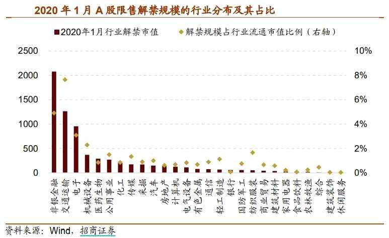 從行業(yè)分布來看,2020 年1 月解禁規(guī)模最高的行業(yè)分別為非銀金融、交運(yùn)和電子,解禁規(guī)模依次為2078億元、1265億元、955億元,分別占所屬行業(yè)流通市值的4.91%、7.65%、3.09%。此外,機(jī)械設(shè)備解禁規(guī)模占其流通市值的比例也超過2%,為2.29%。之前分享過航母概念股可以學(xué)習(xí)。