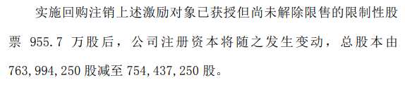此次回購價格為2.17元/股,回購金額為2073.87萬元。次回購注銷后,公司總股本將由 7.64億股減至 7.54億股。