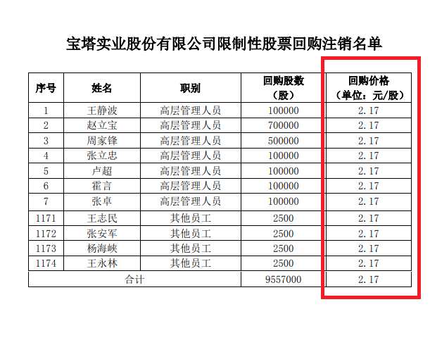 公告顯示,由于1174名激勵對象因2018年業(yè)績考核不達標,不符合激勵條件,寶塔實業(yè)決定上述激勵對象已獲授但尚未解除限售的955.7 萬股限制性股票實施回購注銷。