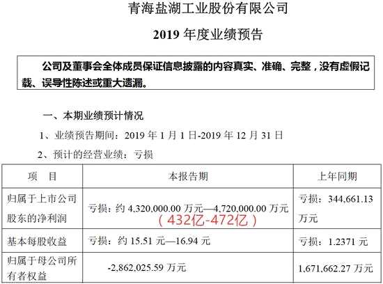昨天,周六,晚上,A股上市公司*ST鹽湖發(fā)布公告,預計2019年將虧損432億元-472億元!本文標題中的432億元還不是最悲觀的預估數(shù)!