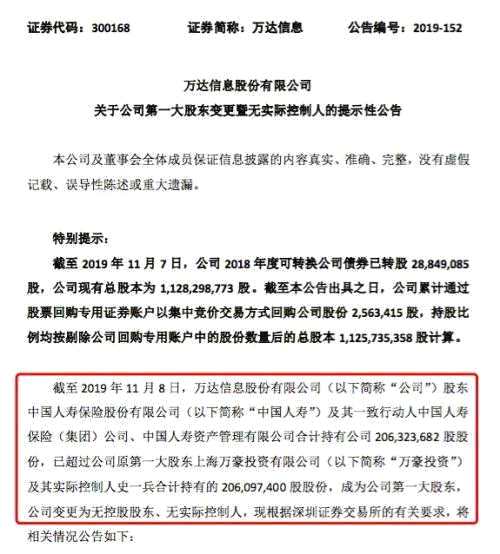 2018年底,中國人壽響應監(jiān)管層號召,積極入市紓困民營企業(yè),出資6.33億元受讓萬達信息原控股股東萬豪投資所持的5500萬股股份,形成第一次舉牌。