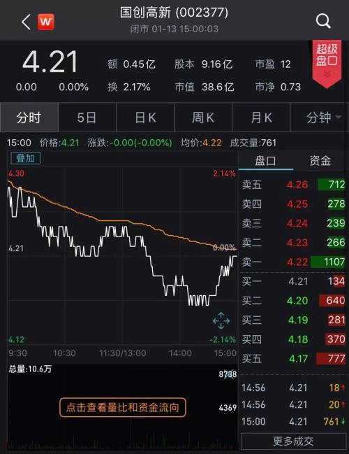 2010年3月,國創(chuàng)高新在中小板上市,發(fā)行價19.8元。1月13日收盤,公司股價無漲跌,收于4.21元,目前市值約39億元。