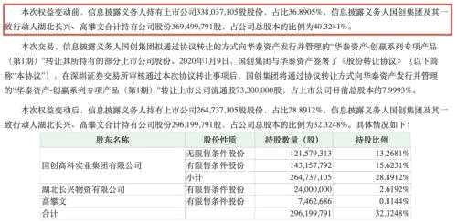 國創(chuàng)集團是國創(chuàng)高新的控股股東。截至2019年三季度末,國創(chuàng)集團持有國創(chuàng)高新3.38億股,持股比例36.89%;加上其一致行動人湖北長興、高攀文的持股,合計持有3.69億股,持股占比40.32%。