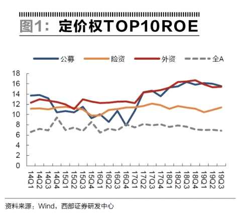 西部證券以內(nèi)資機(jī)構(gòu)(公募、險(xiǎn)資)和外資機(jī)構(gòu)各自定價(jià)權(quán)TOP100標(biāo)的為樣本,通過拆解2014年一季度至2019年三季度的ROE發(fā)現(xiàn)以下特征。
