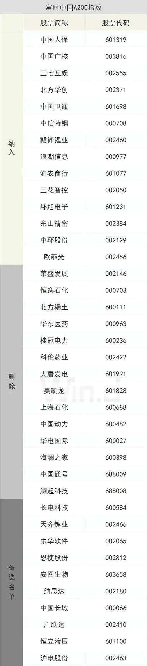 富時(shí)中國(guó)A200指數(shù)將納入中國(guó)人保(601319)、中國(guó)廣核(003816)、三七互娛(002555)、北方華創(chuàng)、【中國(guó)衛(wèi)通(601698)、股吧】(601698)等14只個(gè)股,同時(shí)刪除榮盛發(fā)展(002146)、恒逸石化(000703)、北方稀土(600111)、華東醫(yī)藥(000963)、桂冠電力(600236)等14只個(gè)股。