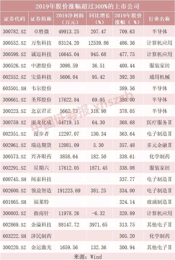 其中,2019年股價(jià)漲幅超過(guò)300%的上市公司中,基本都有較強(qiáng)的業(yè)績(jī)支撐,僅指南針(300803)凈利潤(rùn)出現(xiàn)下滑。