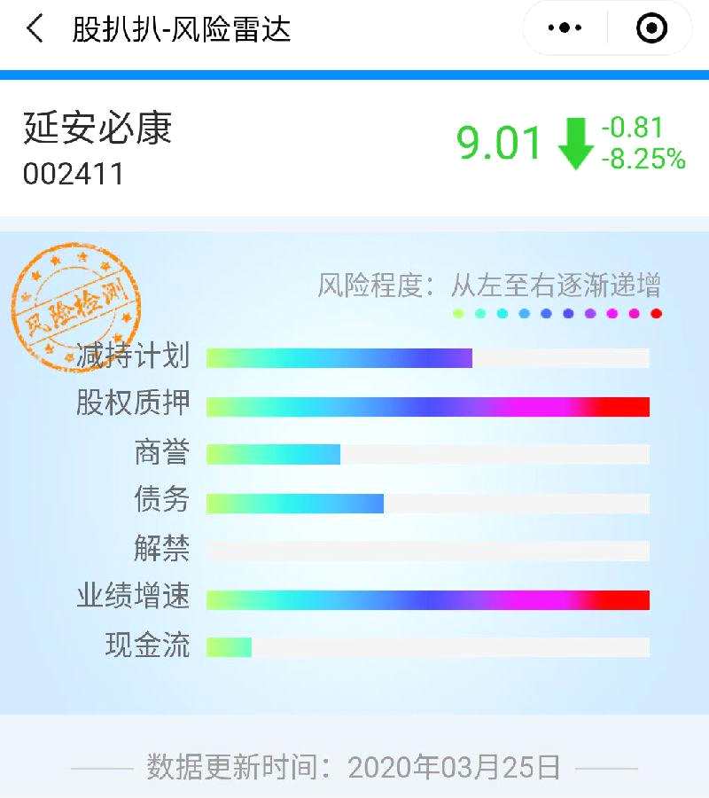 對于投資者來講,我們也可以用專業(yè)的風(fēng)險(xiǎn)排除工具股扒扒小程序來看一下它的風(fēng)險(xiǎn)。比如輸入002411,就可以看到延安必康相關(guān)信息。