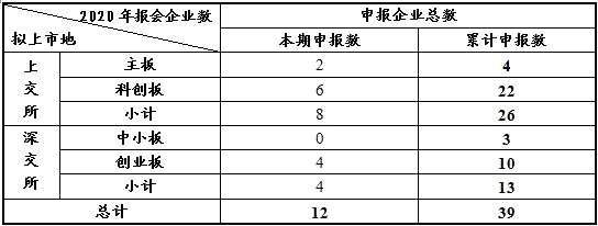 摘要: 本期(3月30日―4月5日)新增申報企業(yè)12家,其中上交所8家(主板2家,科創(chuàng)板6家),深交所創(chuàng)業(yè)板4家。截至4月5日,今年新增申報企業(yè)39家。新增申報企業(yè)概況詳見表一。表一:2020年新增報會企業(yè)概