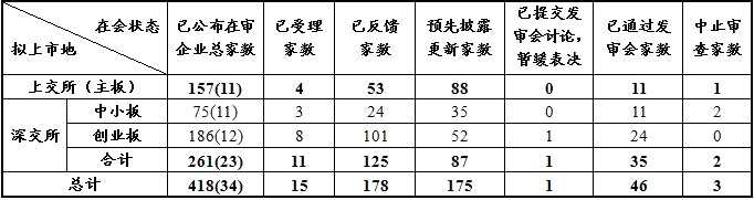 截至4月5日,各板塊在審企業(yè)共500家,其中上交所239家(主板157家,科創(chuàng)板82家),深交所261家(中小板75家,創(chuàng)業(yè)板186家)。在會審核企業(yè)概況詳見表二。