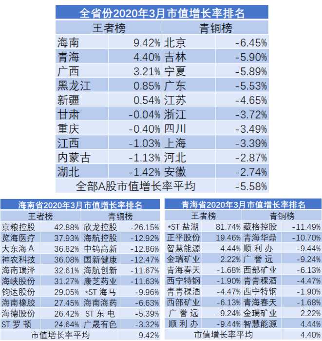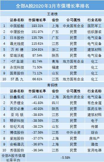 以市值增長(zhǎng)率為主要排行指標(biāo),從不同地區(qū)、行業(yè)、市值規(guī)模等多個(gè)維度進(jìn)行橫向和縱向比較,2020年3月A股市值增長(zhǎng)排行榜如下: