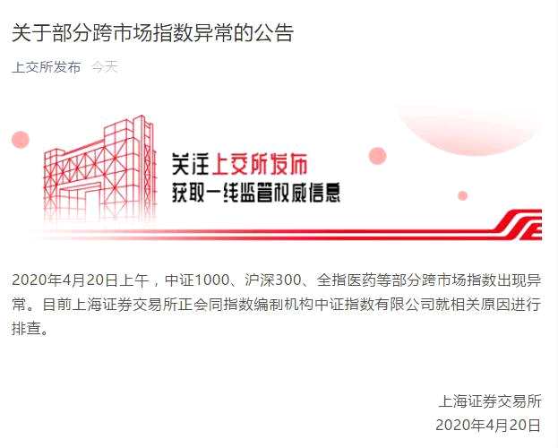 對(duì)此,上交所發(fā)布公告稱,2020年4月20日上午,中證1000、滬深300、全指醫(yī)藥等部分跨市場(chǎng)指數(shù)出現(xiàn)異常。目前上海證券交易所正會(huì)同指數(shù)編制機(jī)構(gòu)中證指數(shù)有限公司就相關(guān)原因進(jìn)行排查。