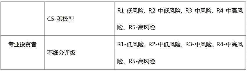 根據(jù)普通投資者測評得分,將普通投資者劃分為不同的風(fēng)險等級:C1-最低風(fēng)險等級、C1-保守型、C2-相對保守型、C3-穩(wěn)健型、C4-相對積極型和C5-積極型。