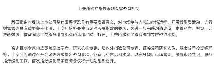 近日,上交所宣布建立指數(shù)編制專家咨詢機(jī)制,首次指數(shù)編制專家咨詢會(huì)議將于近期組織召開(kāi)。