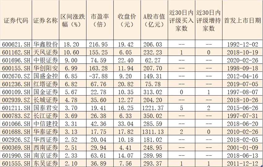 個股方面,【華鑫股份(600621)、股吧】(600621)、天風(fēng)證券(601162)、中銀證券(601696)、華創(chuàng)陽安(600155)、國盛金控(002670)、紅塔證券(601236)、國金證券等7只個股月內(nèi)累計漲幅逾5%。