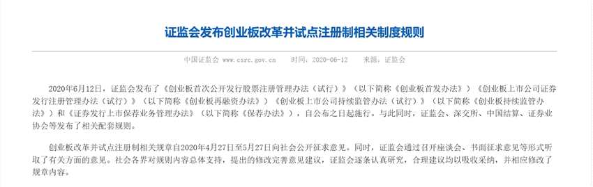 6月12日,證監(jiān)會發(fā)布創(chuàng)業(yè)板改革并試點注冊制相關(guān)制度規(guī)則。