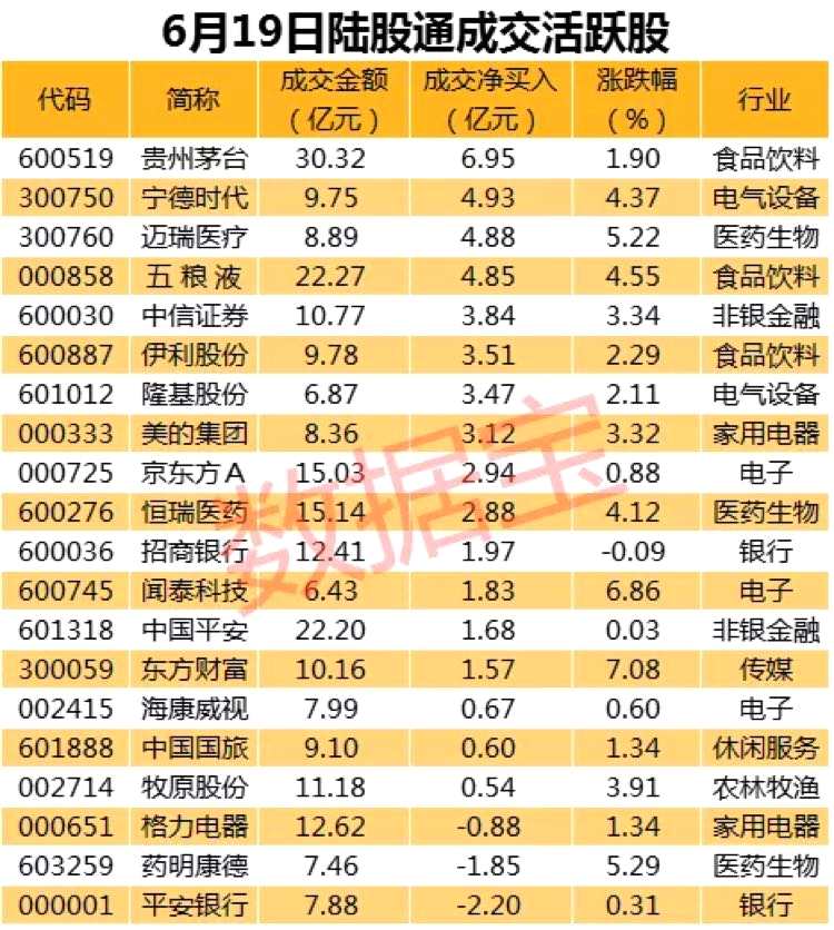 當(dāng)日的成交活躍股方面,滬股通前十大成交活躍股中,貴州茅臺(tái)(600519)成交額為30.32億元,成交金額居首;其次是中國平安、恒瑞醫(yī)藥(600276),成交金額分別為22.2億元、15.14億元。以凈買賣金額統(tǒng)計(jì),貴州茅臺(tái)凈買入額為6.95億元,凈買入金額居首,該股收盤股價(jià)上漲1.9%。凈賣出金額最多的是平安銀行,凈賣出2.2億元,收盤股價(jià)上漲0.31%。