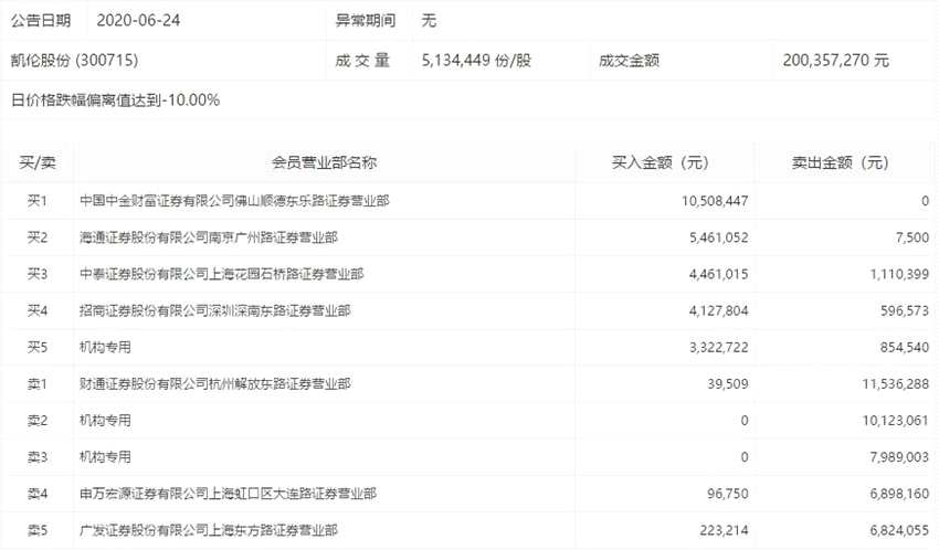 從盤后公布的龍虎榜來看,可以發(fā)現(xiàn)兩家機(jī)構(gòu)成為主要的賣出力量,分居賣出席位的第2席和第3席,合計(jì)凈賣出金額1811萬元。此外,財(cái)通證券股份有限公司杭州解放東路營業(yè)部占據(jù)賣1席位,賣1到賣3席位合計(jì)賣出金額2965萬元。而“接盤方”主要是中國中金財(cái)富證券有限公司佛山順德東樂路營業(yè)部,買入1051萬元,另外有一個(gè)機(jī)構(gòu)席位買入332萬元。整體來看,交易前5席位累計(jì)凈賣出1549萬元。