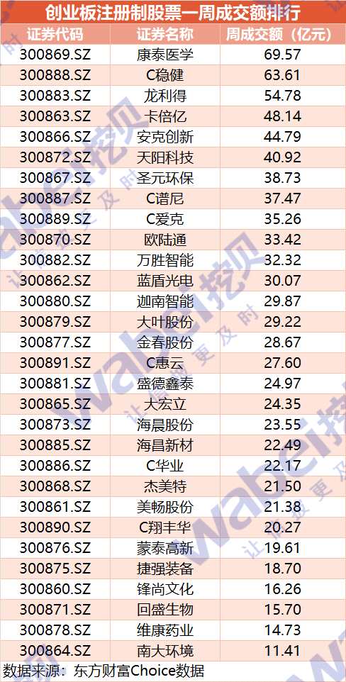 截至本周,創(chuàng)業(yè)板注冊(cè)制下共有30家股票上市。整體來看,漲幅位居前列的股票為本周上市的新股惠云鈦業(yè)、翔豐華;【海昌新材(300885)、股吧】、龍利得則出現(xiàn)下跌。換手率方面,30只股票交投活躍,28家換手率都超過了100%。