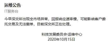 另外根據(jù)一份運(yùn)維公告顯示,今早深交所出現(xiàn)全市場異常,回報(bào)響應(yīng)速率慢,可能影響客戶委托交易及無法撤單,目前深交所正在處理。