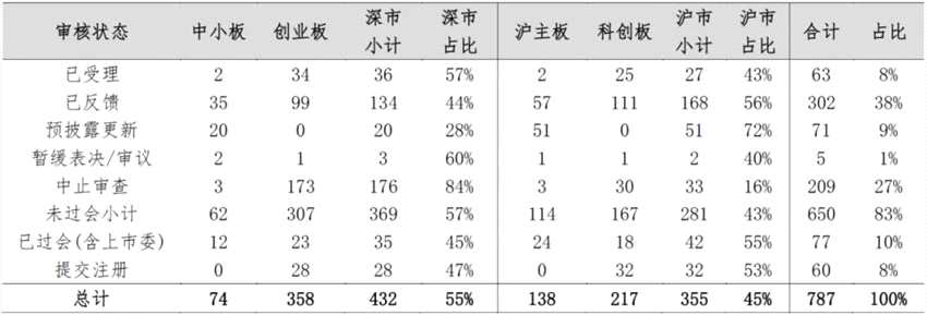 截至2020年10月11日,在審企業(yè)共787家(含提交注冊(cè)),較2020年6月末環(huán)比增加30%。其中深市432家(中小板74家、創(chuàng)業(yè)板358家),占比55%,環(huán)比增加20個(gè)百分點(diǎn);滬市355家(滬主板138家、科創(chuàng)板217家),占比45%。在審企業(yè)審核狀態(tài)詳見表1。