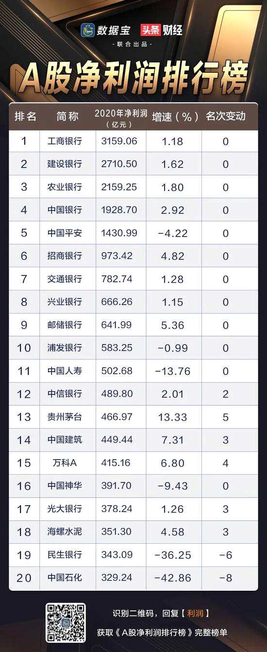 摘要: 數(shù)據(jù)寶、今日頭條聯(lián)合出品作者:數(shù)據(jù)寶郭潔★導(dǎo)讀★數(shù)據(jù)寶發(fā)布《A股凈利潤排行榜》和《A股虧損排行榜》,透視在重重艱險的2020年,行業(yè)和個股業(yè)績的風(fēng)云變化。