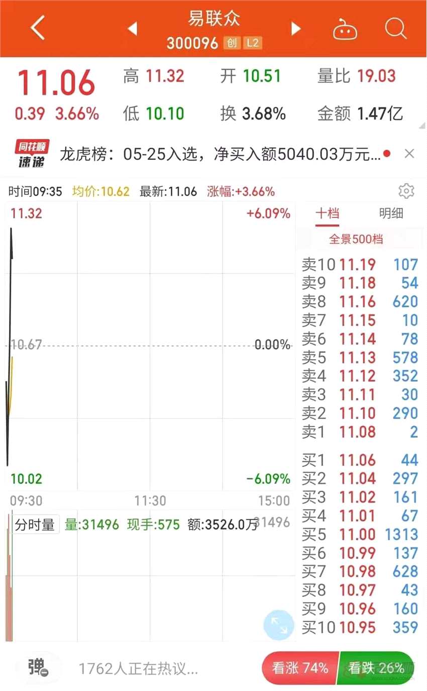 今日開盤,易聯(lián)眾低開超2%,隨后快速殺跌,跌幅迅速擴(kuò)大至近5%。隨后又向上反攻,跌幅縮窄。截至發(fā)稿,易聯(lián)眾漲約3.6%。
