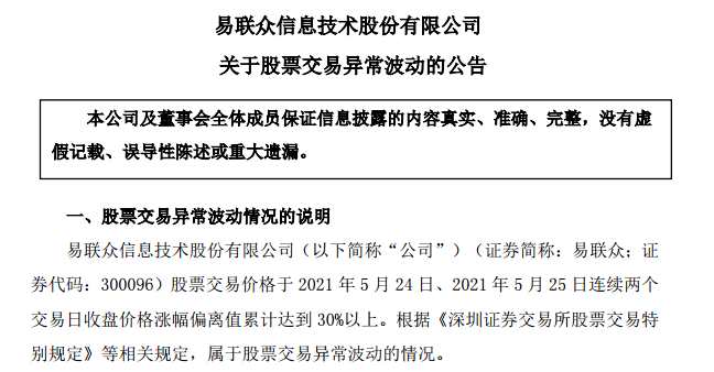 5月25日晚間,易聯(lián)眾發(fā)布關(guān)于股票交易異常波動(dòng)的公告稱,公司關(guān)注到近期有媒體報(bào)道公司與華為鴻蒙系統(tǒng)等方面的內(nèi)容,經(jīng)核查,截至目前,公司未參與鴻蒙系統(tǒng)建設(shè)和鴻蒙核心技術(shù)的研發(fā),公司依托鴻蒙系統(tǒng)研發(fā)公司內(nèi)部的部分軟件和系統(tǒng),目前沒有形成相應(yīng)的研發(fā)成果,沒有相應(yīng)的產(chǎn)品落地,該事項(xiàng)對(duì)公司本年年度業(yè)績沒有較大影響。請(qǐng)廣大投資者謹(jǐn)慎決策,注意投資風(fēng)險(xiǎn)。