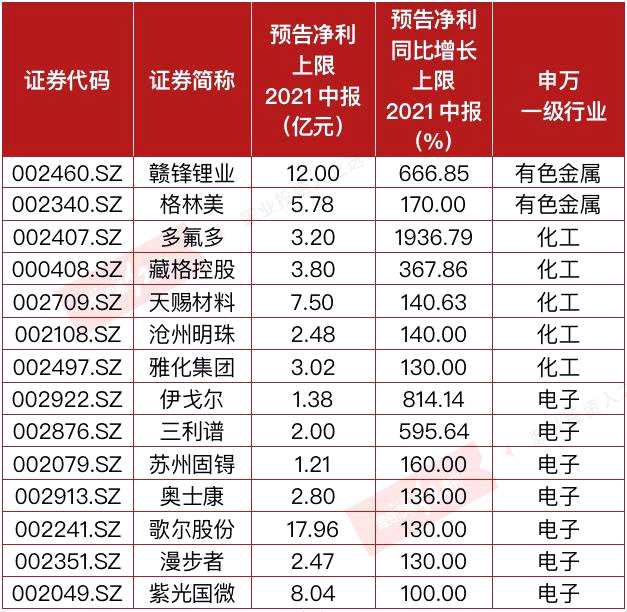進一步來看,若從中報最高預(yù)增幅度超過100%且凈利預(yù)增上限超過1億元進行篩選,有色、化工等行業(yè)中的鋰電池產(chǎn)業(yè)鏈;電子行業(yè)等個股的“入選標(biāo)的”最為集中。如鋰電池產(chǎn)業(yè)鏈中的贛鋒鋰業(yè)(002460)、格林美(002340)、多氟多(002407)等,中報預(yù)告凈利上限分別為12.00億元、5.78億元、3.20億元,同比增幅分別為666.85%、170.00%、1936.79%。電子行業(yè)中的歌爾股份(002241)、紫光國微(002049)、奧士康(002913)等,中報預(yù)告凈利上限分別為17.96億元、8.04億元、2.80億元,同比增幅分別為130.00%、100.00%、136.00%。(見表1)