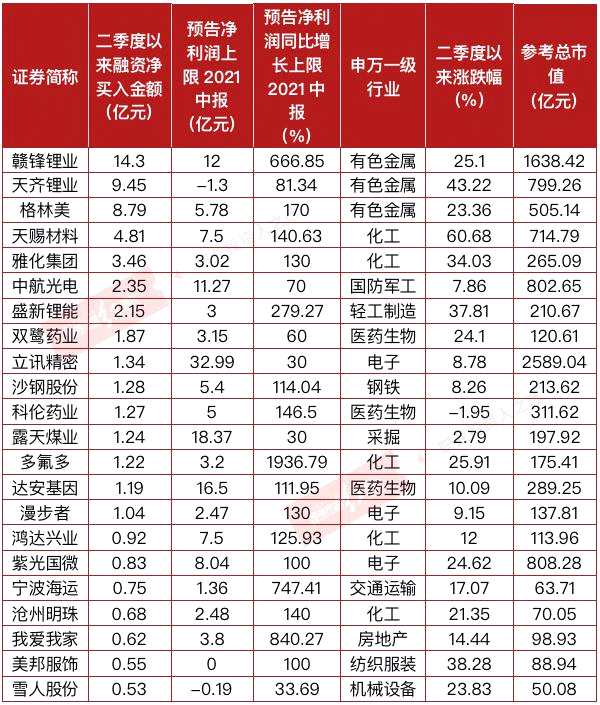 統(tǒng)計顯示,在中報預(yù)增公司中,65只個股為兩融標(biāo)的股,其中,有45只在二季度以來獲得杠桿資金給與凈買入,占比同樣高達70%。進一步來看,杠桿資金買入金額較高的公司,鋰電池產(chǎn)業(yè)鏈公司最為聚焦,如凈買入金額前5席均為鋰電池概念公司,其中,如贛鋒鋰業(yè),二季度以來,杠桿資金凈買入金額最高14億元,公司中報預(yù)告凈利潤上限為12.00億元,預(yù)告凈利潤同比增長上限666.85%,最新市值為1638億元。與此同時,凈買入格林美、天賜材料等中等市值公司金額同樣較高,均超過4億元。(見表3)