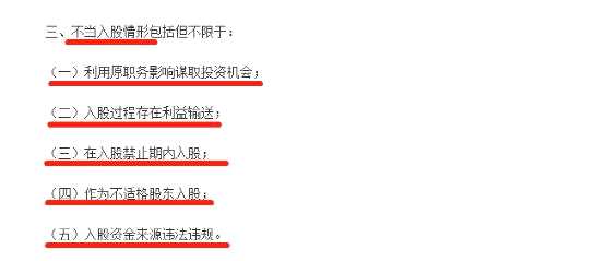證監(jiān)會(huì)系統(tǒng)離職人員存在利用原職務(wù)影響謀取投資機(jī)會(huì)、入股過(guò)程存在利益輸送、在入股禁止期內(nèi)入股、作為不適格股東入股、入股資金來(lái)源違法違規(guī)等情形的屬于不當(dāng)入股。
