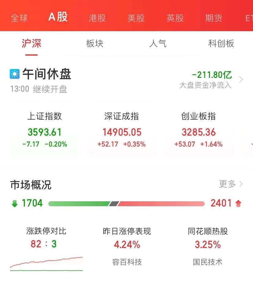 近日有券商高呼科創(chuàng)板是本輪上漲牛市的續(xù)航發(fā)動機,上午暴漲3.05%,各大指數(shù)當中,上證指數(shù)微跌0.2%,深證成指漲0.35%,創(chuàng)業(yè)板指數(shù)大漲1.64%,兩市成交額6214億元,個股2401個上漲,1704個下跌。