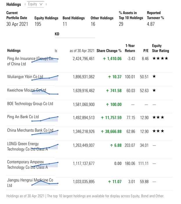 值得注意的是,全球第四大中國(guó)股票基金――來(lái)自摩根大通的“摩根中國(guó)a股機(jī)會(huì)基金”4月大手筆加倉(cāng)茅臺(tái)和五糧液。4月底基金持有的貴州茅臺(tái)股份數(shù)環(huán)比增加約742%,持有的五糧液股份數(shù)增加10%。第一大重倉(cāng)股中國(guó)平安股份數(shù)環(huán)比增加1410.06%。晨星數(shù)據(jù)顯示,該基金最新規(guī)模超過500億元人民幣。