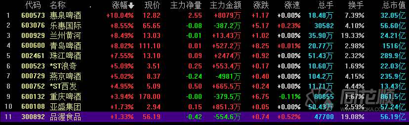 啤酒概念強(qiáng)勢(shì),更多的是可以看作是白酒火爆的衍生行情,今年2月白酒迎來(lái)集體回調(diào),但白酒概念彈性良好,尤其是今年二三線白酒股業(yè)績(jī)?cè)鏊俪A(yù)期,山西汾酒(600809)、水井坊(600779)、舍得酒業(yè)(600702)、酒鬼酒(000799)等個(gè)股股價(jià)已再創(chuàng)歷史新高,繼續(xù)推動(dòng)整個(gè)板塊個(gè)股上漲。近期二三線白酒表現(xiàn)出超強(qiáng)的動(dòng)能。截至今日收盤,海南椰島(600238)、皇臺(tái)酒業(yè)(000995)、老白干酒(600559)、大豪科技(603025)、青青稞酒(002646)漲停。