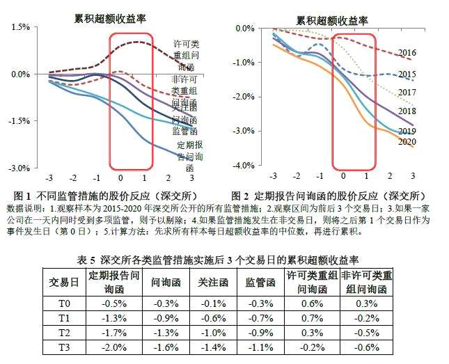 交易所監(jiān)管能夠向投資者揭示風(fēng)險(xiǎn),定期報(bào)告問(wèn)詢函的風(fēng)險(xiǎn)警示作用最為明顯,并購(gòu)重組問(wèn)詢函的市場(chǎng)反應(yīng)較弱。除并購(gòu)重組問(wèn)詢函之外,交易所各項(xiàng)監(jiān)管措施公告當(dāng)日及次日上市公司股價(jià)明顯下跌(見(jiàn)圖1),表明市場(chǎng)認(rèn)可交易所監(jiān)管的風(fēng)險(xiǎn)警示作用。從市場(chǎng)反應(yīng)強(qiáng)度來(lái)看,定期報(bào)告問(wèn)詢函的監(jiān)管效果最明顯,發(fā)函之后3個(gè)交易日的累積超額收益率為-2%;問(wèn)詢函和關(guān)注函的效果次之,累積超額收益率分別為.6%和-1.4%。