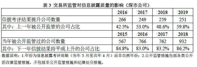 上市公司信息披露質(zhì)量得到一定程度提升。交易所監(jiān)管可以讓上市公司更加熟悉信息披露規(guī)則,統(tǒng)計(jì)結(jié)果顯示,深交所2019年信息披露考評(píng)結(jié)果提升的公司中,59.8%的公司上一年被交易所實(shí)施過(guò)公開(kāi)監(jiān)管措施,這一比例較三年前提升17.3個(gè)百分點(diǎn);2018年被公開(kāi)監(jiān)管過(guò)的公司中,有86.2%的公司下一年信息披露考評(píng)結(jié)果維持穩(wěn)定或上升,較三年前上升1.3個(gè)百分點(diǎn)。