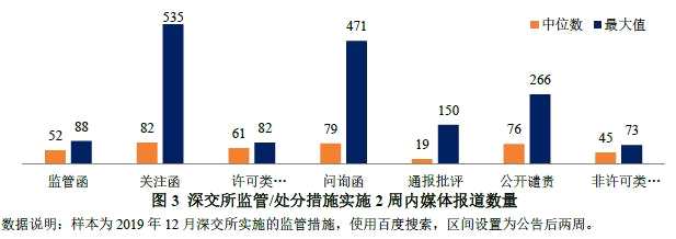 一是強(qiáng)化媒體的監(jiān)督治理作用,形成監(jiān)督合力。媒體關(guān)注度反映了某一事件的熱度,交易所實(shí)施的各項(xiàng)監(jiān)管措施中,媒體對(duì)問(wèn)詢函和關(guān)注函的關(guān)注度最高。以2019年12月份實(shí)施的監(jiān)管措施為例,問(wèn)詢函和關(guān)注函兩周內(nèi)最多分別有535條和471條新聞報(bào)道(參考證監(jiān)會(huì)首次表態(tài)瑞幸咖啡事件,兩周內(nèi)共756條相關(guān)新聞)。