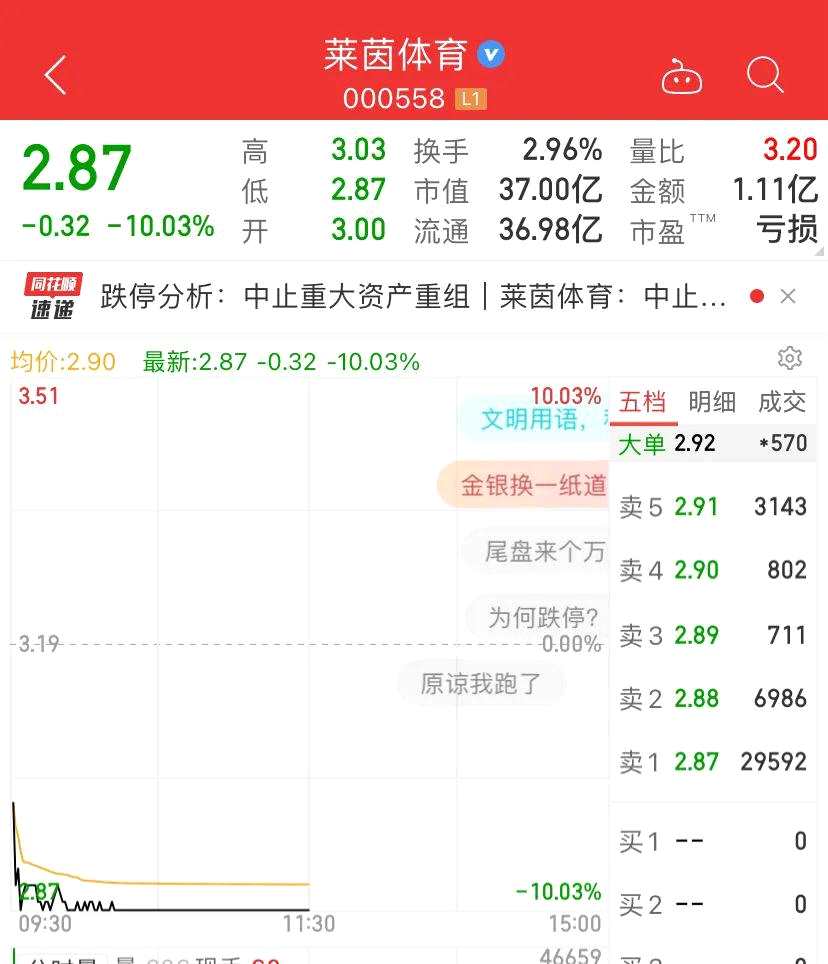 終止重組的萊茵體育走勢(shì)也不妙,大幅低開后直線跌停。萊茵體育原擬以發(fā)行股份的方式購(gòu)買成都文旅63.34%股份。