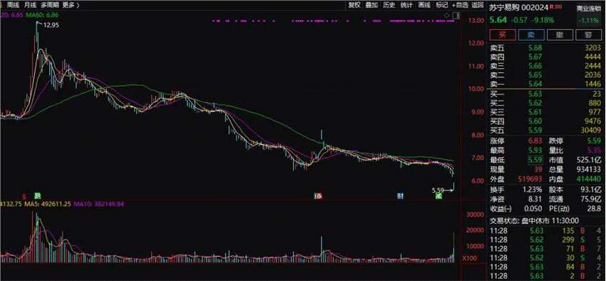 負(fù)面不斷的蘇寧易購(gòu),股價(jià)一再暴跌,今日又是大股東遭司法凍結(jié),以及強(qiáng)平的公告,股價(jià)盤中跌停,創(chuàng)出近8年來新低,最終上午收跌9.18%,報(bào)5.64元,總市值525億元。