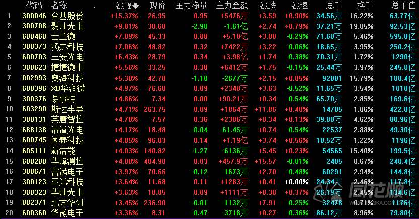 摘要: 繼昨日市場大跌下半導體逆市上漲,今日開盤后半導體相關(guān)概念繼續(xù)走高。截至發(fā)稿,臺基股份(300046)、聚燦光電(300708)、士蘭微(600460)、楊杰科技、三安光電(600703)、捷捷微電(3