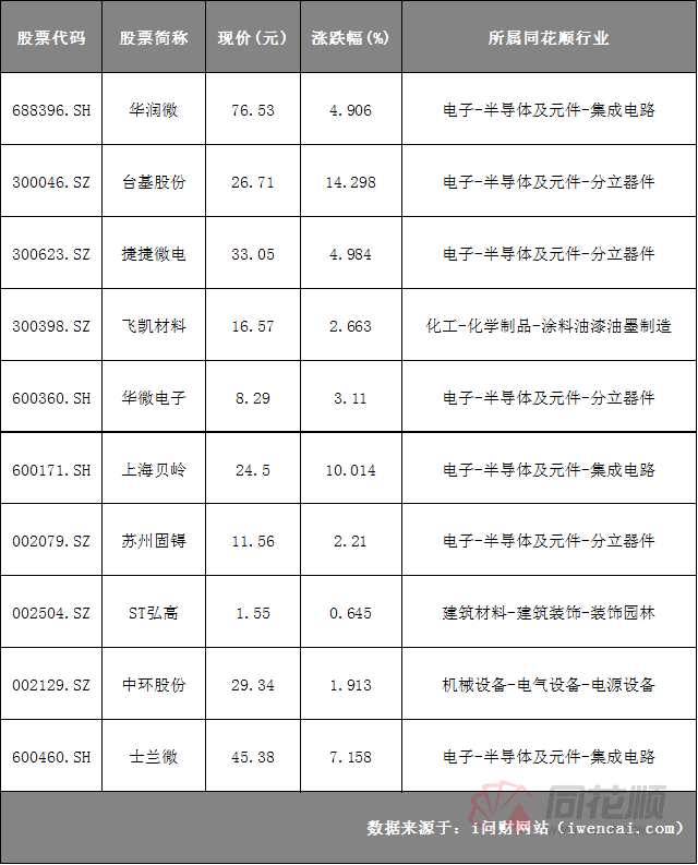 繼昨日市場大跌下半導體逆市上漲,今日開盤后半導體相關(guān)概念繼續(xù)走高。截至發(fā)稿,臺基股份(300046)、聚燦光電(300708)、士蘭微(600460)、楊杰科技、三安光電(600703)、捷捷微電(300623)、奧??萍迹?02993)、華潤微、【易事特(300376)、股吧】(300376)、斯達半導(603290)等漲幅居前。