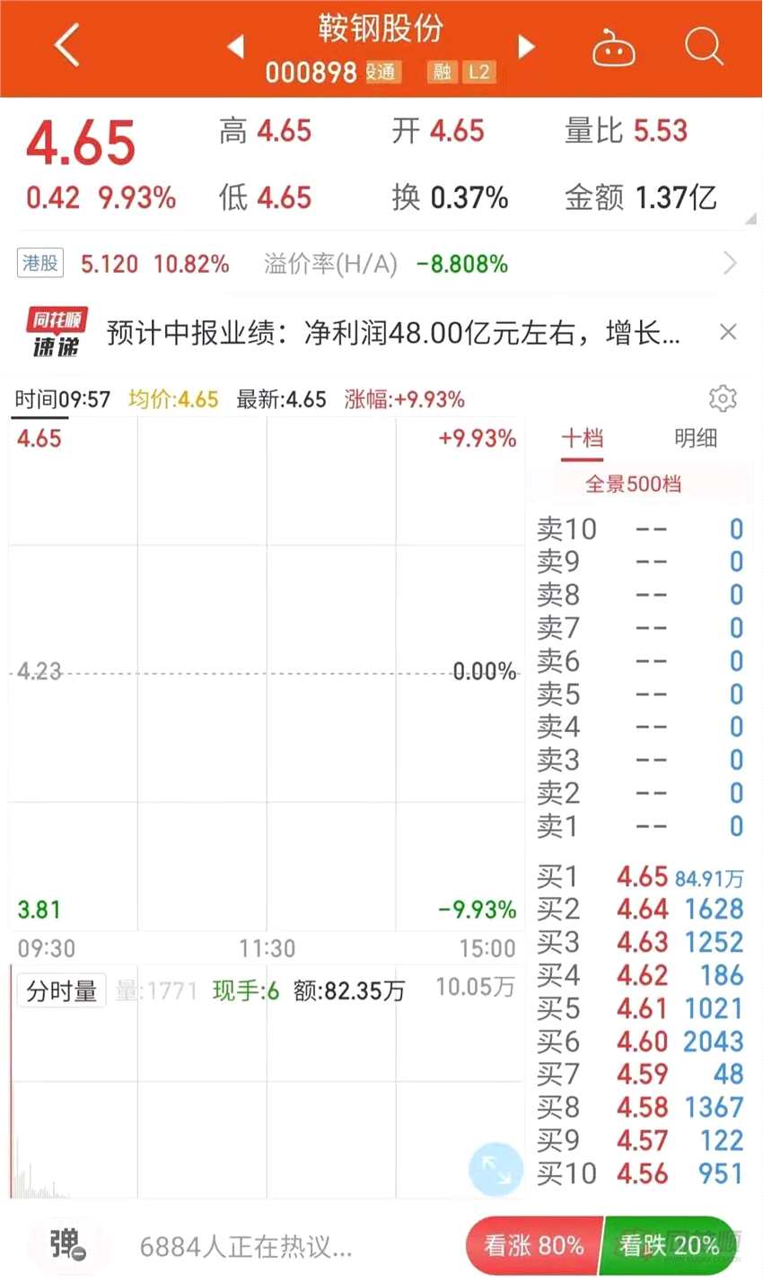 6月21日早間開盤,鞍鋼股份(000898)一字漲停,截至發(fā)稿封單超過80萬手,股價報(bào)4.65元/股。