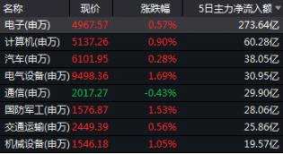 從資金流向來看,5日主力資金凈流入額最高的行業(yè)是電子板塊,超過270億元,遙遙領先于其他行業(yè);計算機板塊的5日主力資金凈流入額超60億元,排名第二;汽車板塊的5日主力資金凈流入額則排名第三,為38億元。